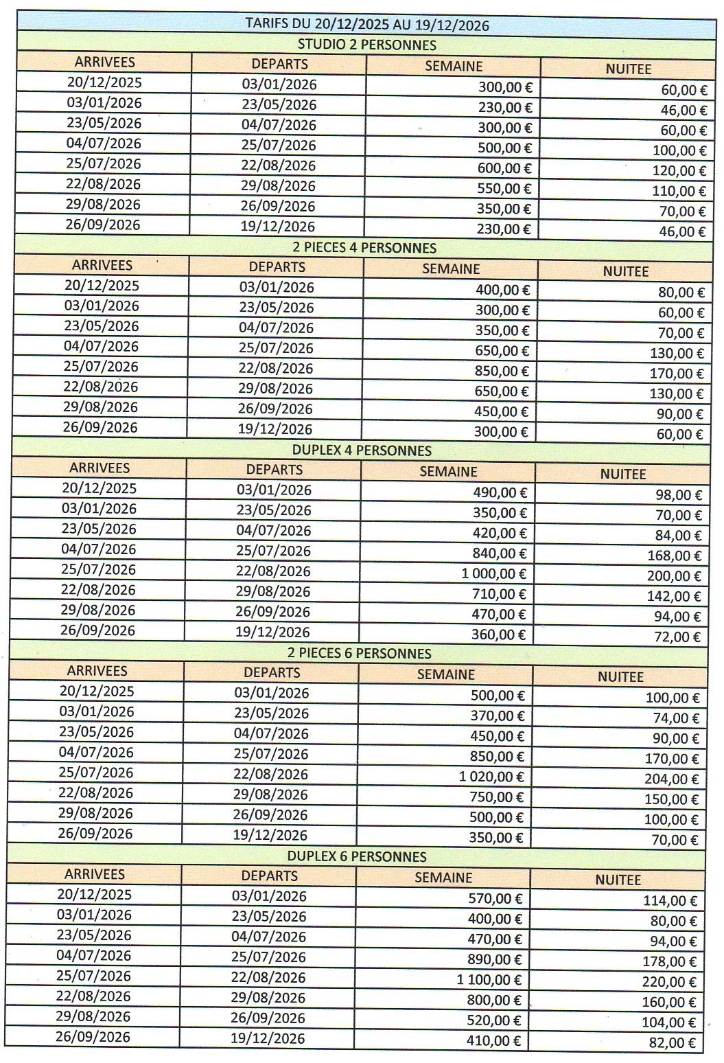 TARIFS* SAISON 2026